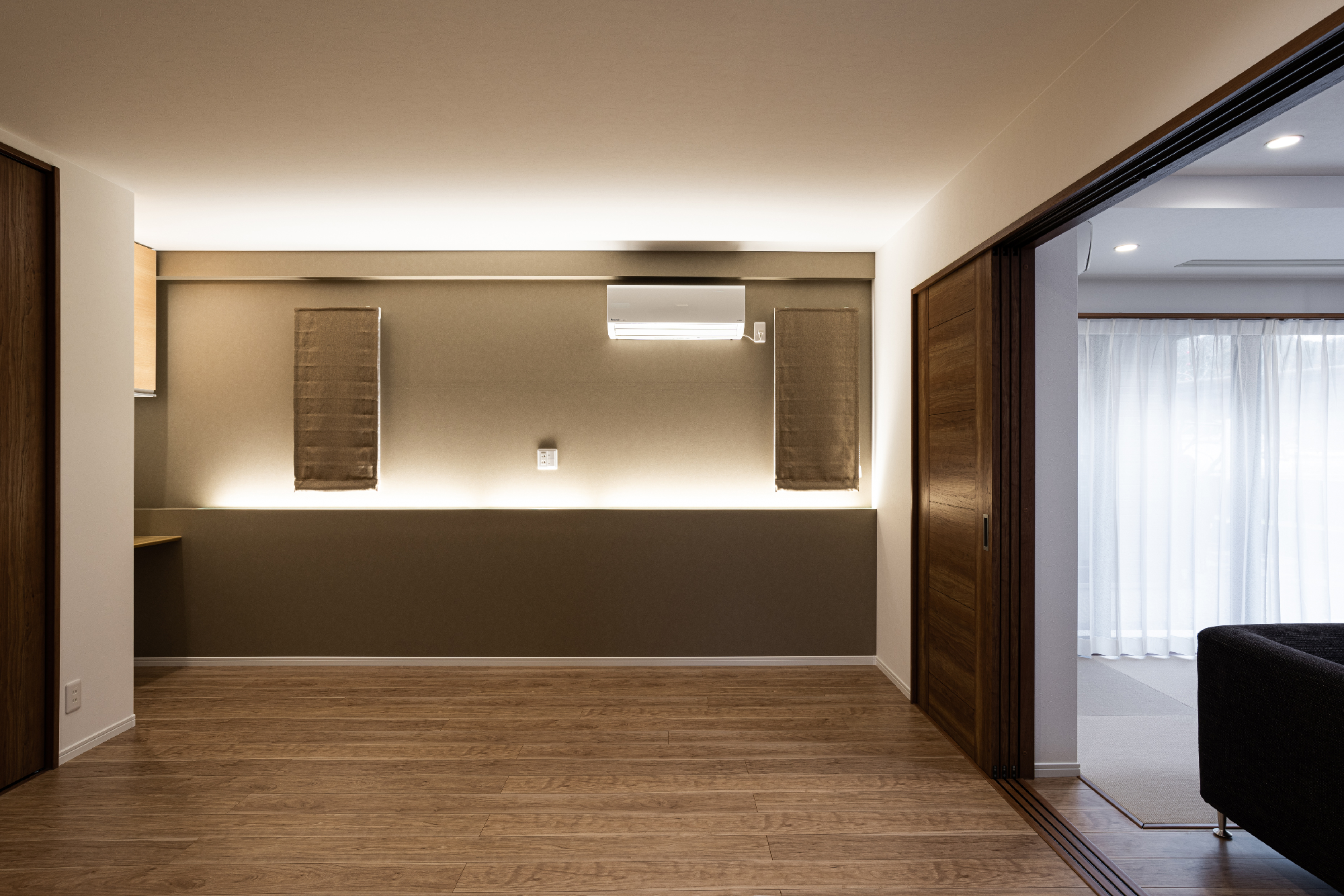 リビングの隣には寝室を設計。間仕切り扉を仕切ると個室に、普段は大きなお部屋にと使い勝手がとても便利です。