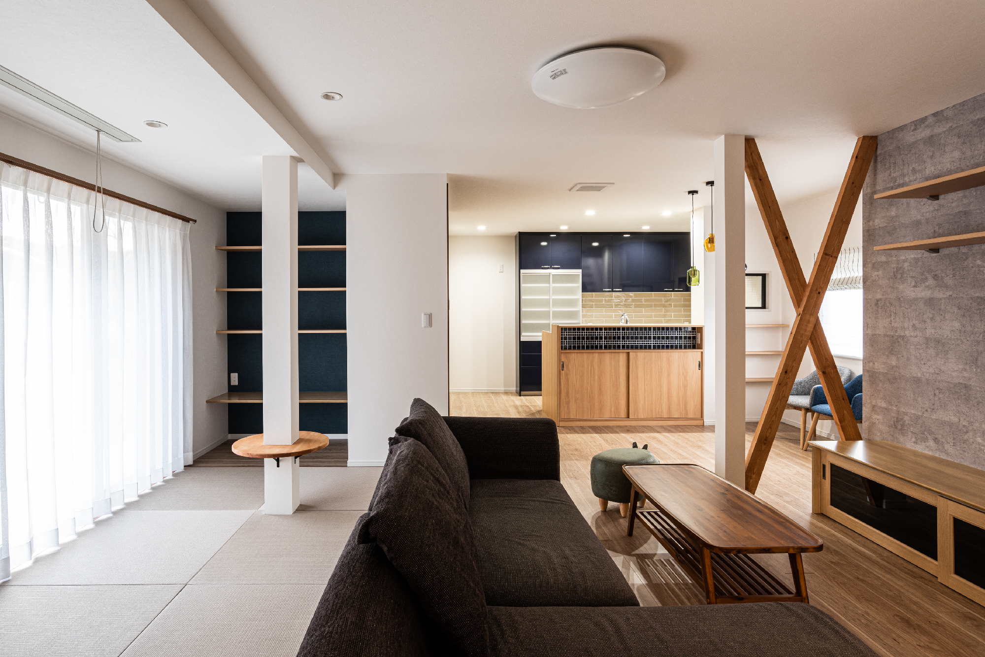 奥にご主人の書斎(座椅子タイプ)や抜けない柱まわりにはコーヒーテーブルを造作しました。