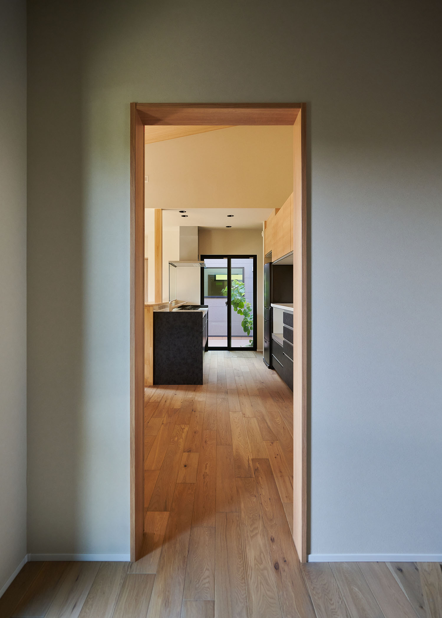 玄関から中庭まで視線が一直線に繋がり、空間に開放感を持たせる。