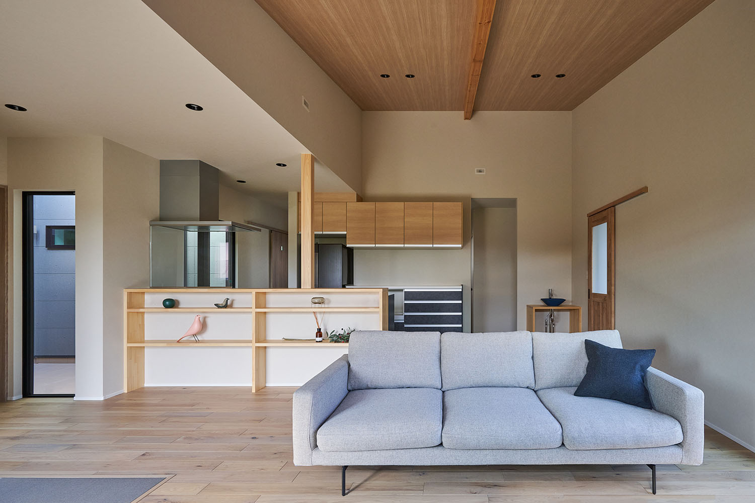 リビングとキッチンを分ける低い棚は、視線を遮らずに収納スペースを確保。