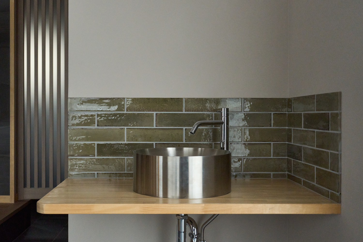 土間続きに設けた、タイルとステンレスの手洗い場。