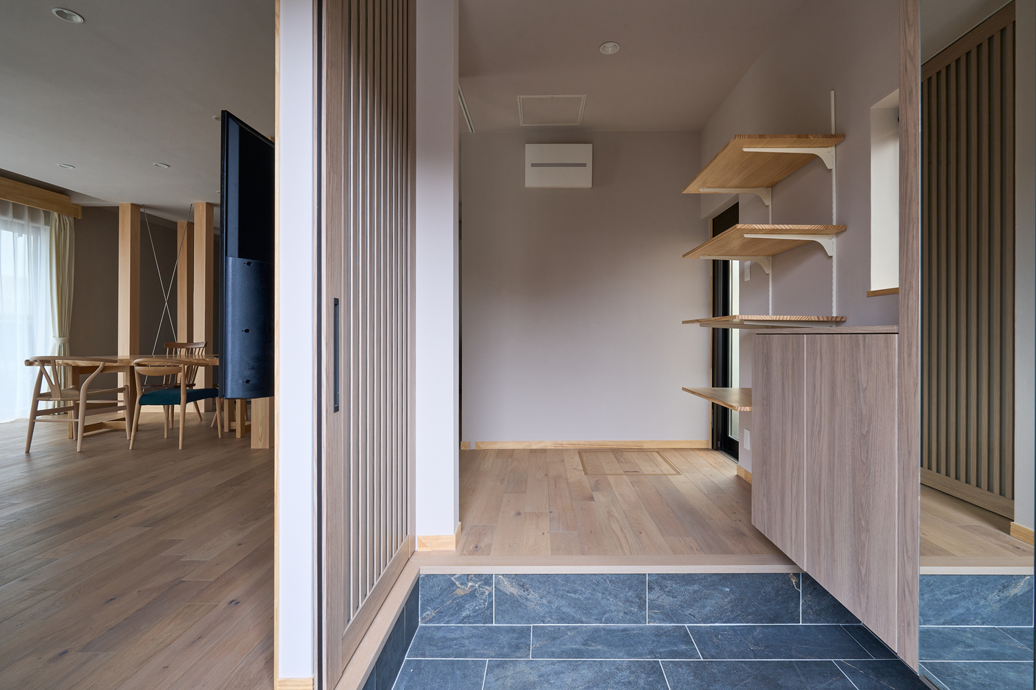 大判タイルと木の棚で設えた、シンプルで清潔感のあるトイレ空間