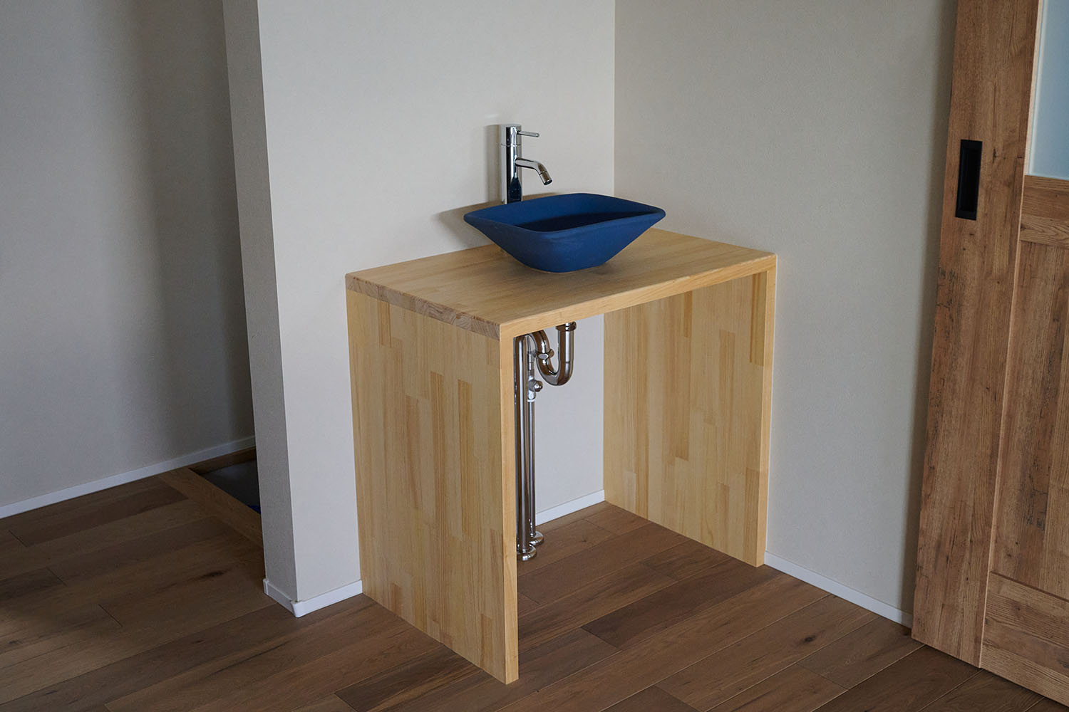 青いボウルと木製カウンターが目を引く、利便性に優れた玄関脇の手洗い。