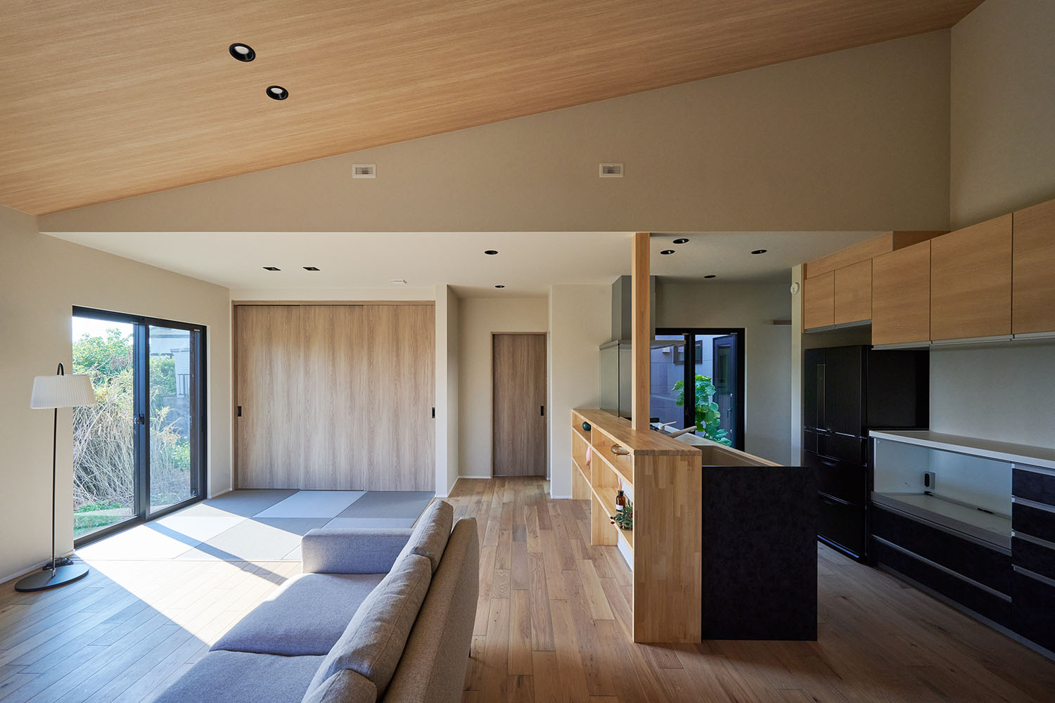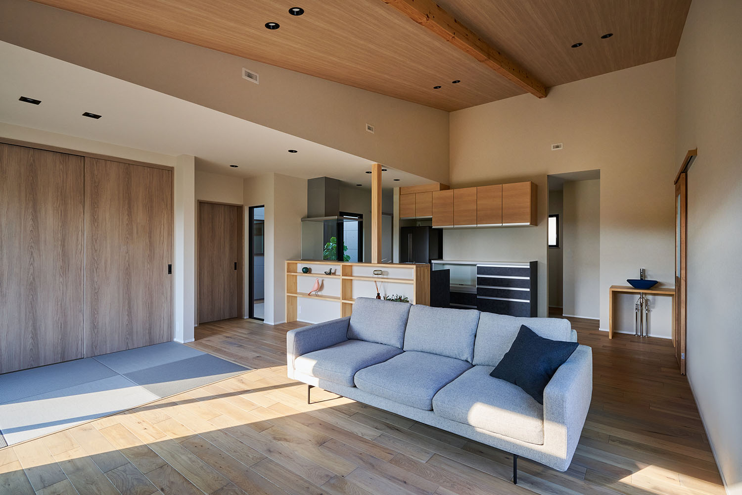 木の勾配天井が温もりを添え、フラットな畳スペースと繋がる開放的なLDK。