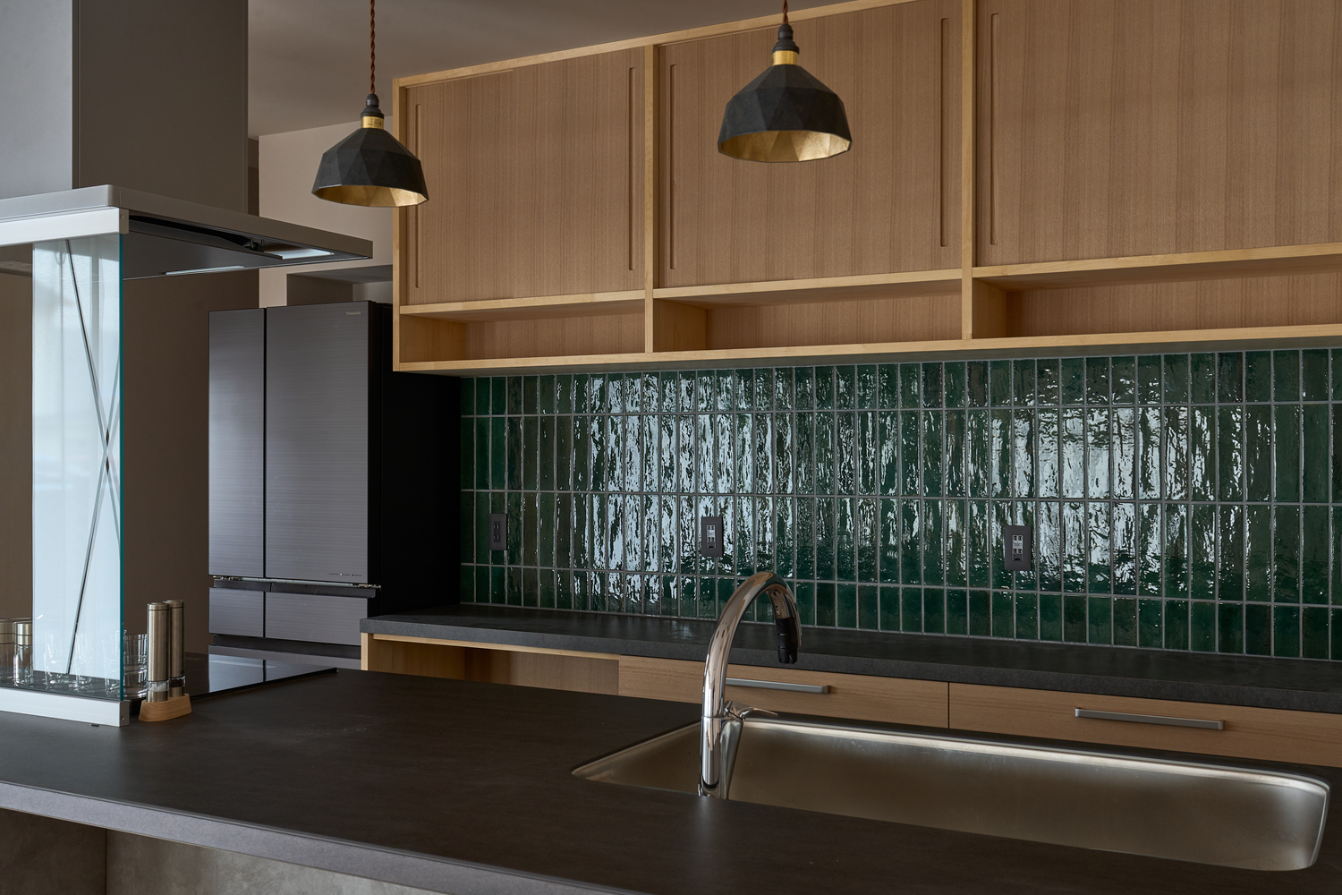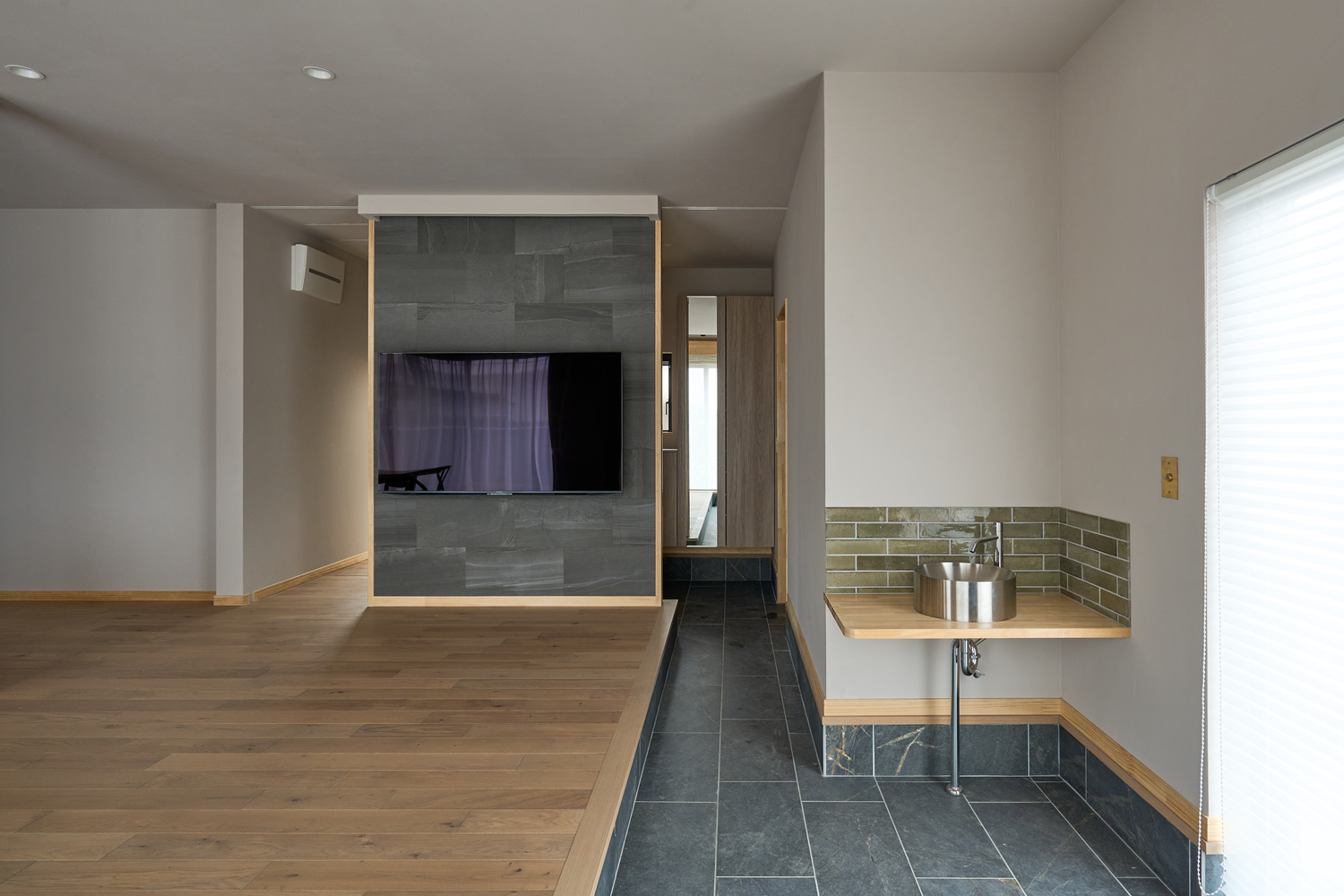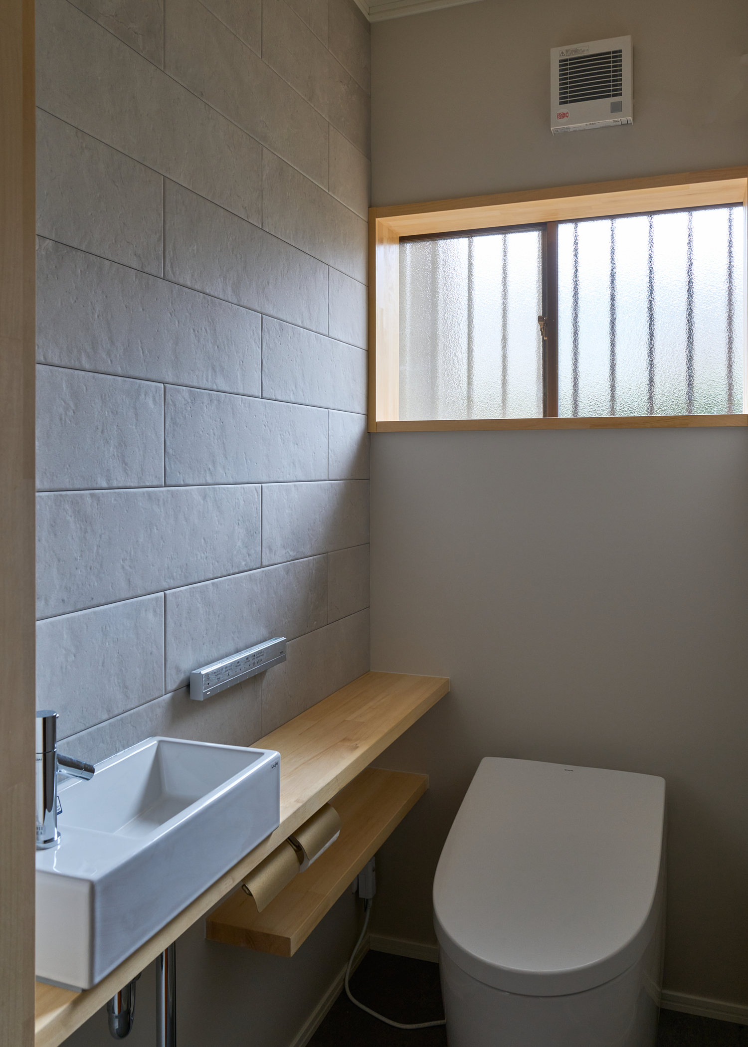 大判タイルと木の棚で設えた、シンプルで清潔感のあるトイレ空間